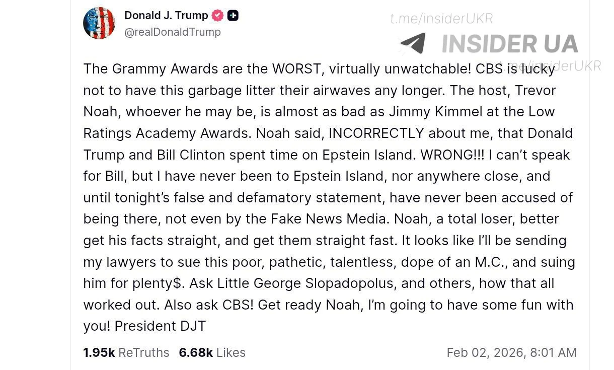 ԱՄՆ նախագահ Դոնալդ Թրամփը Գրեմմի մրցանակաբաշխությունը անվանեց «աղբ» և սպառնաց դատի տալ հաղորդավարին՝ Էպշտեյնի կղզու մասին կատակի համար։