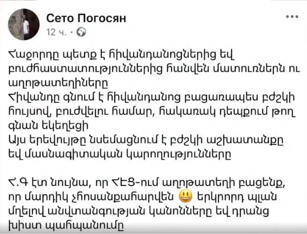 Հիշեցնենք, որ Քրիստինե Պողոսյանի եղբայրը՝ երեկ հանդես էր եկել հրապարակմամբ, որում ասվում էր, որ պետք է հիվանդանոցներից ու բուժհաստատություններից հանվեն մատուռներն ու աղոթատեղիները: