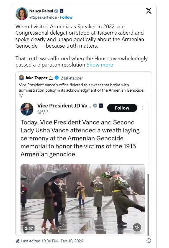 ԱՄՆ Ներկայացուցիչների տան նախկին խոսնակ Նենսի Փելոսին արձագանքել է փոխնախագահ Ջեյմս Դի Վենսի կողմից Հայոց ցեղասպանության վերաբերյալ գրառման ջնջմանը։