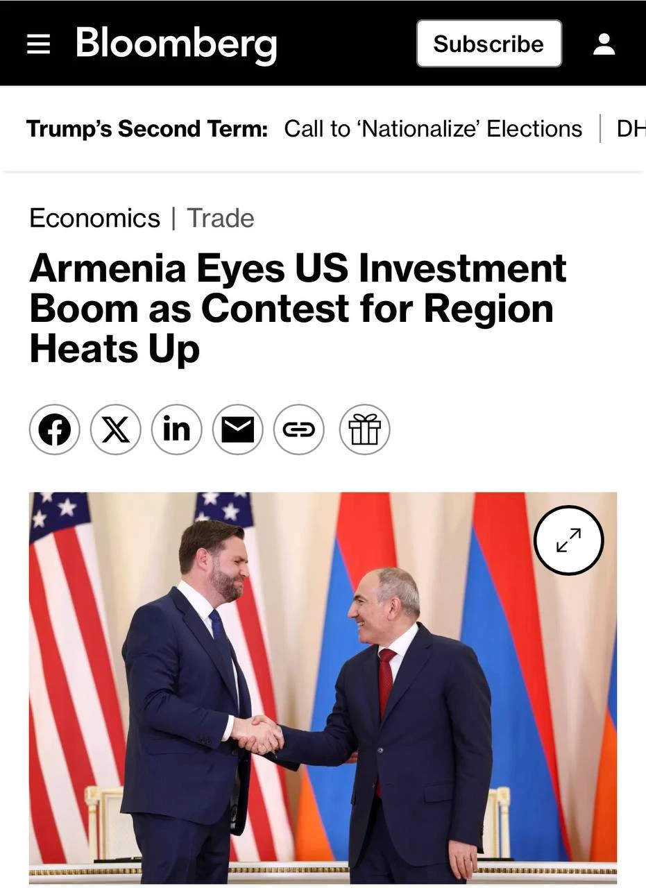Երևան կատարած այցի ընթացքում ԱՄՆ փոխնախագահ Ջ.Դ. Վենսը ստորագրել է խաղաղ միջուկային էներգիայի ոլորտում համագործակցության համաձայնագիր՝ մինչև 9 միլիարդ դոլար արժողությամբ։ Լրացուցիչ 4 միլիարդ դոլար նախատեսված է Nvidia-ի մասնակցությամբ արհեստական բանականության նախագծի ընդլայնման համար։ Այս մասին գրում է Bloomberg գործակալությունը: