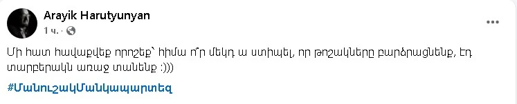 Անդրադառալով ընդդիմադիր գործիչների հայտարարություններին՝ ՀՀ վարչապետի աշխատակազմի ղեկավար Արայիկ Հարությունյանը «Ֆեյսբուք»-ի իր էջում գրել է․
