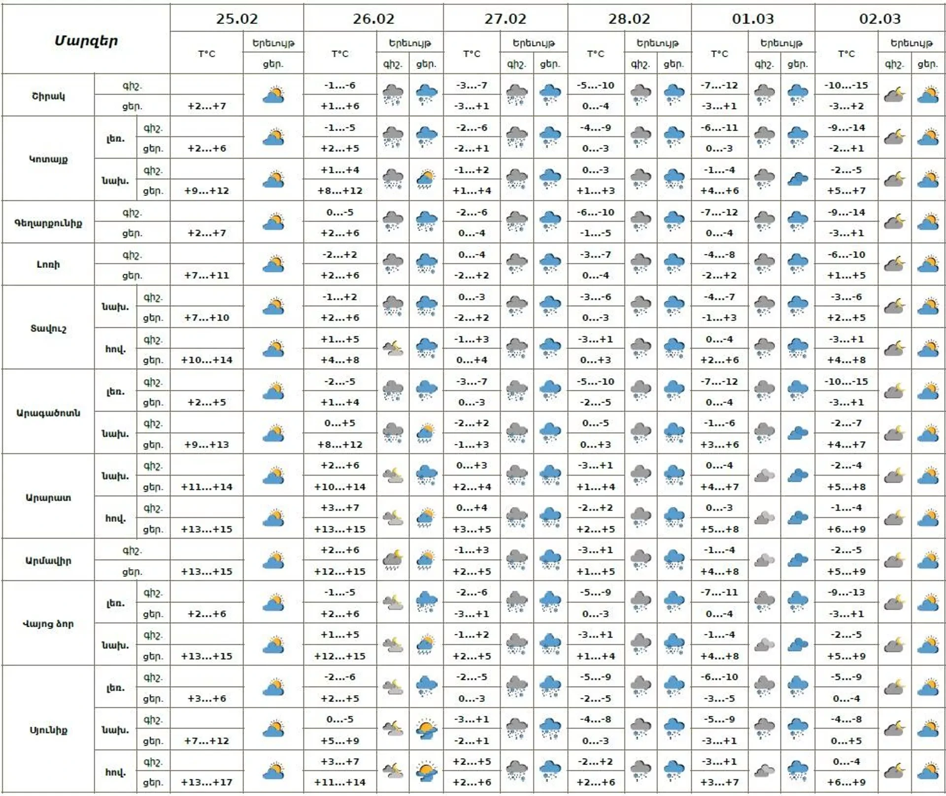 Օդի ջերմաստիճանը փետրվարի 26-ի ցերեկը, 27-28-ին աստիճանաբար կնվազի 8-12 աստիճանով: