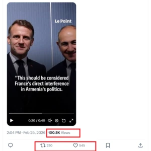 «Սա Ֆրանսիայի ուղիղ միջամտությունն է Հայաստանի քաղաքական կյանքին։ Նույն իրավիճակը եղել է նաև Մոլդովայում խորհրդարանական ընտրություններից առաջ»,- կարդում ենք այդ տեսանյութի ենթագրերում։ Տեսանյութը «X»-ում լայն տարածում էր գտել։