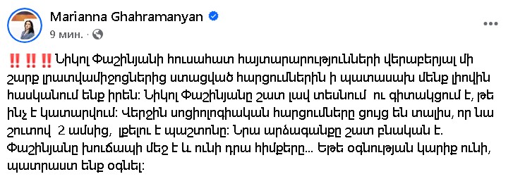 «Նիկոլ Փաշինյանի հուսահատ հայտարարությունների վերաբերյալ մի շարք լրատվամիջոցներից ստացված հարցումներին ի պատասախ մենք լիովին հասկանում ենք իրեն: Նիկոլ Փաշինյանը շատ լավ տեսնում ու գիտակցում է, թե ինչ է կատարվում: