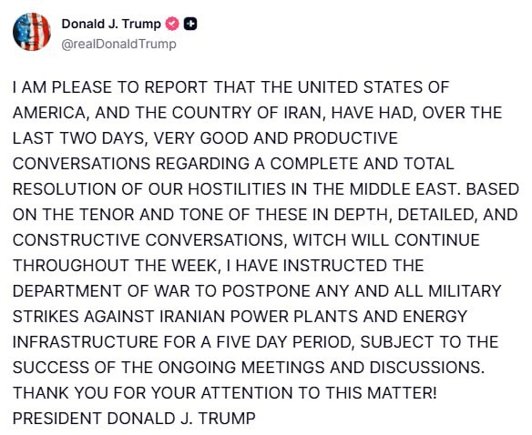 «Վերջին երկու օրերի ընթացքում ԱՄՆ-ն և Իրանը շատ լավ և արդյունավետ զրույցներ են ունեցել Մերձավոր Արևելքում թշնամական գործողությունների ամբողջական լուծման վերաբերյալ։ Հանձնարարել եմ հետաձգել Իրանի էլեկտրակայանների և էներգետիկ ենթակառուցվածքների դեմ բոլոր ռազմական հարվածները հինգ օրով՝ կախված ընթացիկ հանդիպումների և քննարկումների հաջողությունից»,- գրել է Դոնալդ Թրամփը։