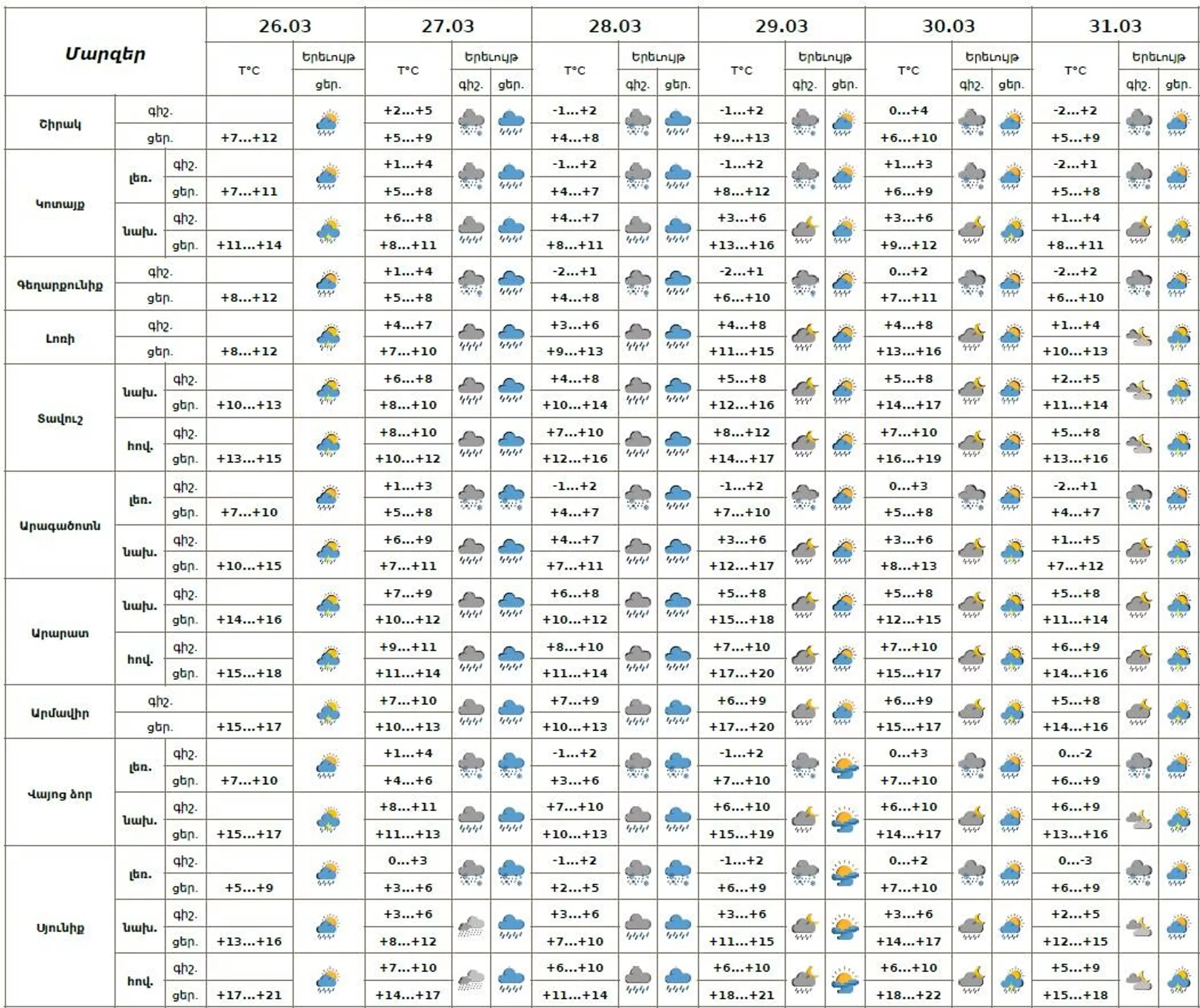 Հայաստանի Հանրապետության տարածքում մարտի 27-31-ին շրջանների մեծ մասում ժամանակ առ ժամանակ սպասվում են տեղումներ. լեռնային գոտիներում՝ թաց ձյան, նախալեռնային և հովտային գոտիներում՝ թաց ձյան։ Մարտի 27-ին Սյունիքում և առանձին լեռնային շրջաններում տեղումները կլինեն զգալի, ուղեկցվելով ցածր հորիզոնական տեսանելիությամբ։ Տեղեկությունը հայտնում է «Հիդրոօդերևութաբանության և մոնիթորինգի կենտրոնը»։