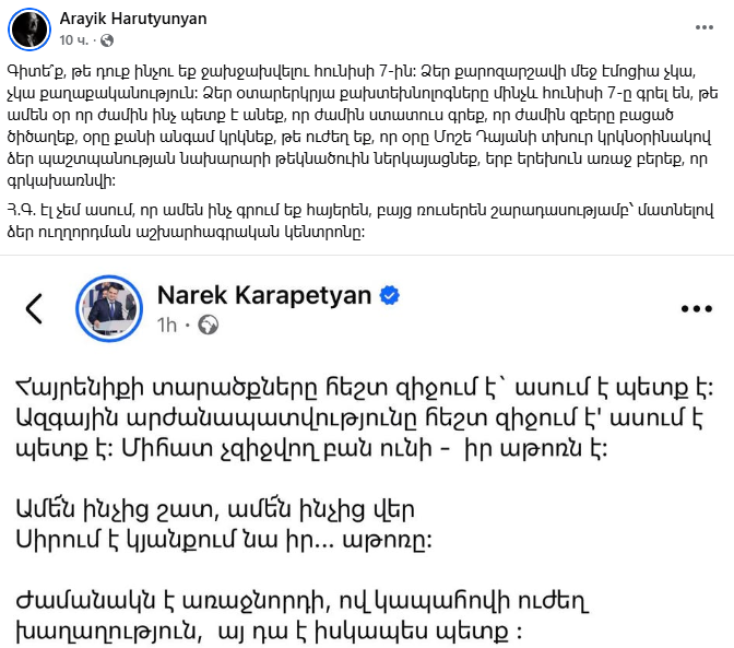 Հ.Գ. էլ չեմ ասում, որ ամեն ինչ գրում եք հայերեն, բայց ռուսերեն շարադասությամբ՝ մատնելով ձեր ուղղորդման աշխարհագրական կենտրոնը»,- գրել է ՀՀ վարչապետի աշխատակազմի ղեկավար Արայիկ Հարությունյանը: