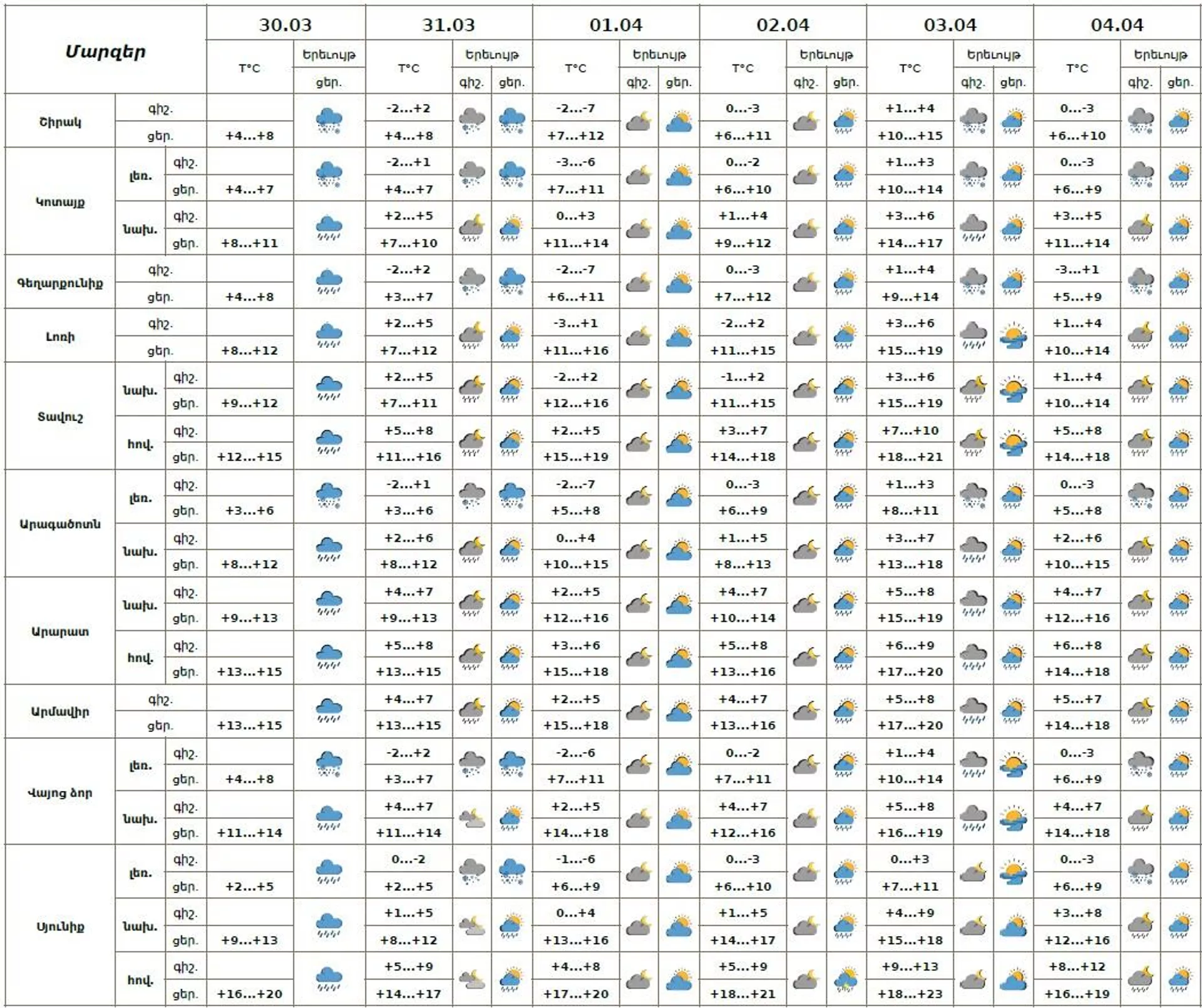 Օդերևութաբանների կանխատեսումների համաձայն` տեղումները լեռնային գոտիներում կդտվեն գիշերը՝ ձյան, ցերեկը՝ թաց ձյան, իսկ նախալեռնային և հովտային գոտիներում՝ անձրևի տեսքով։ Քամին կլինի հարավարևմտյան` 2-5 մ/վ արագությամբ։