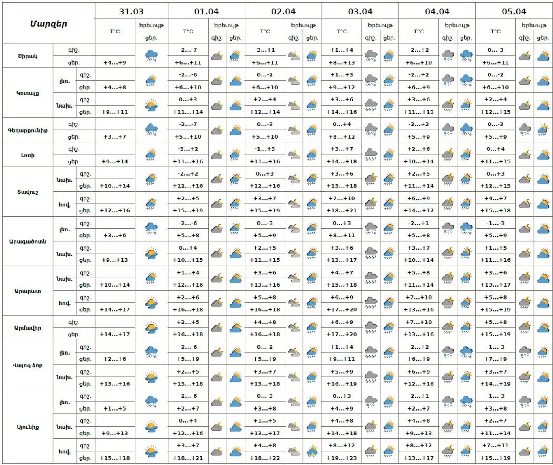 Հայաստանի Հանրապետության տարածքում ապրիլի 1-ի ցերեկը, 5-ին առանձին շրջաններում, 2-ի ցերեկը, 3-4-ին ժամանակ առ ժամանակ շրջանների զգալի մասում սպասվում են տեղումներ. լեռնային գոտիներում՝ թաց ձյան, նախալեռնային և հովտային գոտիներում՝ անձրևի տեսքով։ Տեղեկությունը հայտնում է «Հիդրոօդերևութաբանության և մոնիթորինգի կենտրոն» -ը: