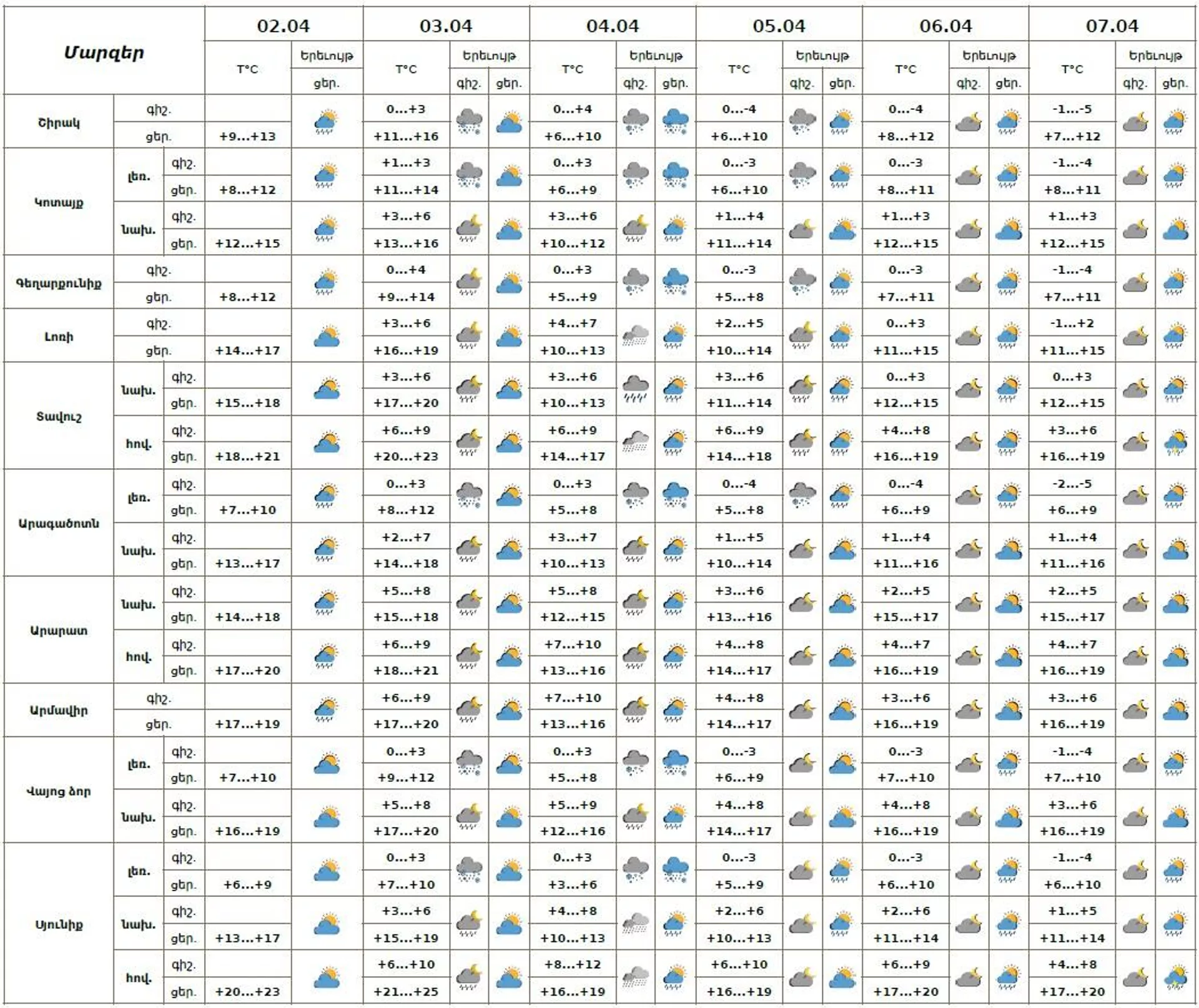 Ապրիլի 3-5-ին առանձին շրջաններում սպասվում է քամու ուժգնացում 14-17 մ/վ արագությամբ: Օդի ջերմաստիճանն ապրիլի 3-ին կբարձրանա ևս 2-3 աստիճանով։