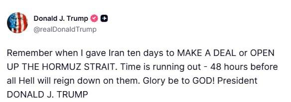 «Ժամանակը սպառվում է. 48 ժամ, մինչև իսկական դժոխքը կիջնի նրանց գլխին։ Փա՜ռք Աստծուն», - հայտարարել է նա։