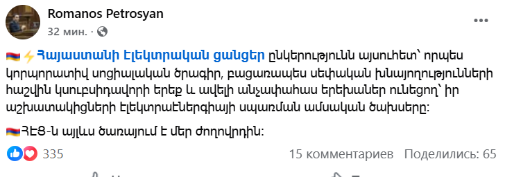 Հայաստանի էլեկտրական ցանցեր ընկերությունն այսուհետ՝ որպես կորպորատիվ սոցիալական ծրագիր, բացառապես սեփական խնայողությունների հաշվին կսուբսիդավորի երեք և ավելի անչափահաս երեխաներ ունեցող՝ իր աշխատակիցների էլեկտրաէներգիայի սպառման ամսական ծախսերը։ Այս մասին ֆեյսբուքիր իր էջում գրել է ՀԷՑ-ի ժամանակավոր պաշտոնակատար Ռոմանոս Պետրոսյանը: