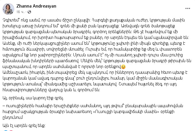 ՀՀ ԿԳՄՍ նախարար Ժաննա Անդրեասյանը «Ֆեյսբուք»-ի իր էջում գրառում է կատարել՝ անդրադառնալով ընդդիմության որոշ շրջանակների կողմից կրթության ոլորտի փոփոխությունների քննադատություններին և առաջարկներին: