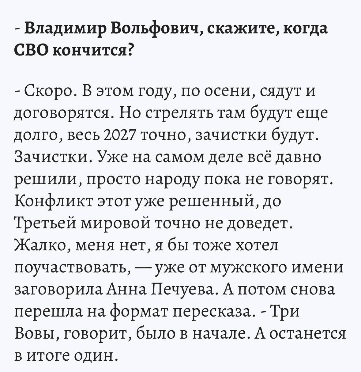 — Շուտով։ Այս տարի, աշնանը, կնստեն ու կպայմանավորվեն։ Բայց կրակոցներն այնտեղ դեռ երկար կշարունակվեն, ողջ 2027 թվականին հաստատ՝ զտումներ կլինեն։ Զտումներ։ Իրականում ամեն ինչ վաղուց արդեն որոշված է, պարզապես ժողովրդին դեռ չեն ասում։ Այս հակամարտությունն արդեն լուծված է, Երրորդ համաշխարհայինի հաստատ չի հասցնի։ Ափսոս, ես չկամ, ես էլ կցանկանայի մասնակցել,— արդեն տղամարդու անունից սկսեց խոսել Աննա Պեչուևան։ Իսկ հետո նորից անցավ պատմելու ձևաչափին․ — Ասում է՝ սկզբում երեք Վովա կար, իսկ վերջում կմնա միայն մեկը։