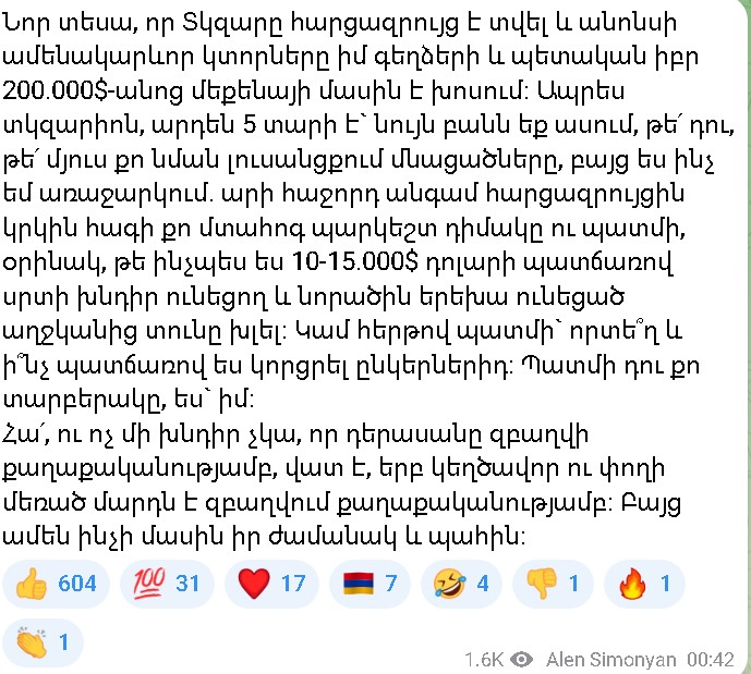 «Նոր տեսա, որ Տկզարը հարցազրույց է տվել և անոնսի ամենակարևոր կտորները իմ գեղձերի և պետական իբր 200.000$-անոց մեքենայի մասին է խոսում: Ապրես տկզարիոն, արդեն 5 տարի է` նույն բանն եք ասում, թե՛ դու, թե՛ մյուս քո նման լուսանցքում մնացածները, բայց ես ինչ եմ առաջարկում. արի հաջորդ անգամ հարցազրույցին կրկին հագի քո մտահոգ պարկեշտ դիմակը ու պատմի, օրինակ, թե ինչպես ես 10-15.000$ դոլարի պատճառով սրտի խնդիր ունեցող և նորածին երեխա ունեցած աղջկանից տունը խլել: Կամ հերթով պատմի` որտե՞ղ և ի՞նչ պատճառով ես կորցրել ընկերներիդ: Պատմի դու քո տարբերակը, ես` իմ: