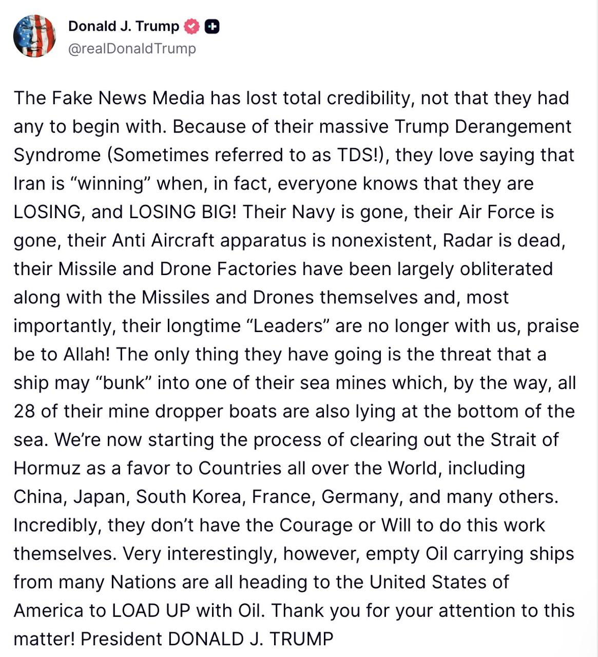 Թրամփը նաև ուշադրություն է հրավիրել էներգակիրների փոխադրման թեմային՝ նշելով, որ տարբեր երկրների դատարկ նավթատար տանկերներ ուղևորվում են Միացյալ Նահանգներ՝ այնտեղ նավթ բեռնելու նպատակով։ Իր հրապարակման ավարտին նա շնորհակալություն է հայտնել այս հարցի նկատմամբ ուշադրության համար։ Նշված հայտարարություններն արտահայտում են Թրամփի դիրքորոշումը և ներկայացվել են առանց հավելյալ անկախ հաստատման։