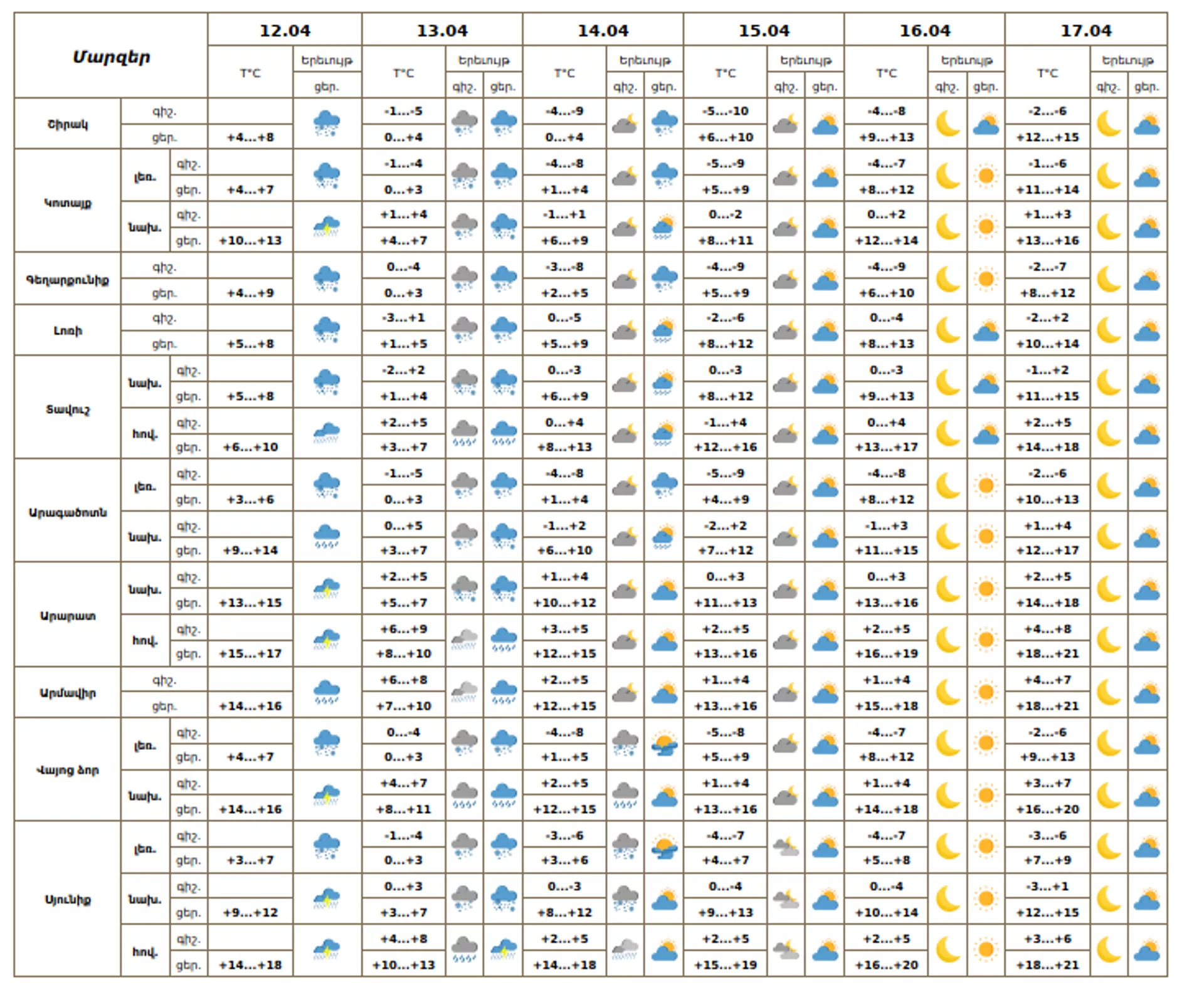 Հայաստանի Հանրապետության տարածքում ապրիլի 13-ին ժամանակ առ ժամանակ շրջանների զգալի մասում սպասվում են տեղումներ, առանձին վայրերում՝ առատ։ Տեղումները ապրիլի 13-ին լեռնային և բոլոր նախալեռնային գոտիներում կդիտվեն ձյան, հովտային գոտիներում՝ անձրևի տեսքով։ Առանձին վայրերում սպասվում է ամպրոպ։ Քամին` հարավարևմտյան` 2-5 մ/վ: Տեղեկությունը հայտնում է «Հիդրոօդերևութաբանության և մոնիթորինգի կենտրոն»։