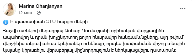 «Հաշվի առնելով մեղադրյալ Գոհար Ղումաշյանի օրինական վարքագիծն ապահովող և դրան խոչընդոտող բոլոր հնարավոր հանգամանքները, այդ թվում՝ վերջինիս անչափահաս երեխաներ ունենալը, որպես խափանման միջոց տնային կալանք կիրառելու վերաբերյալ միջնորդություն է ներկայացվելու դատարան»,- այս մասին հայտնել է ՀՀ հակակոռուպցիոն կոմիտեի նախագահի մամուլի քարտուղար Մարինա Օհանջանյանը: