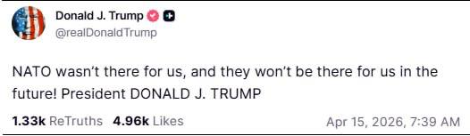 Նախագահ Դոնալդ Ջ. Թրամփը նշել է, որ ՆԱՏՕ-ն իրենց կողքին չի եղել և հետագայում ևս չի լինելու։ Մեկ այլ գրառմամբ նա դիմել է Հռոմի Պապ Լևոնին: