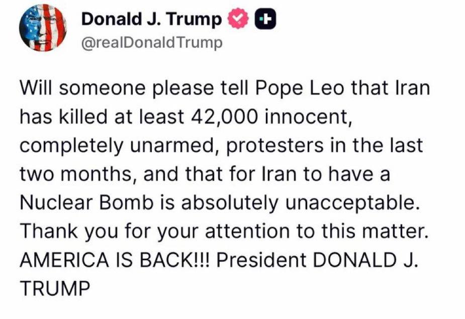 «Կարո՞ղ է որևէ մեկը Հռոմի Պապ Լևոնին (Pope Leo) հայտնել, որ Իրանը վերջին երկու ամսվա ընթացքում սպանել է առնվազն 42,000 անմեղ, լիովին անզեն ցուցարարների, և որ Իրանի կողմից միջուկային ռումբ ունենալը բացարձակապես անընդունելի է: Շնորհակալություն այս հարցին ուշադրություն դարձնելու համար: ԱՄԵՐԻԿԱՆ ՎԵՐԱԴԱՐՁԵԼ Է»,- գրել է Թրամփը։