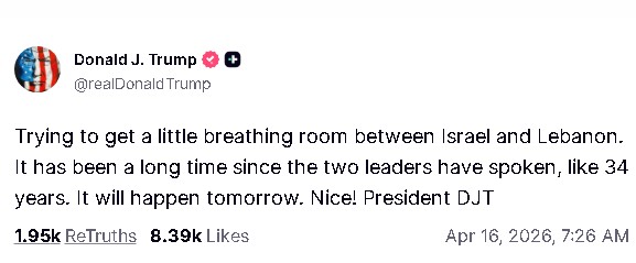 Truth Social-ի իր էջում կատարած գրառման մեջ Դոնալդ Թրամփը նշել է, որ փորձ է արվում Իսրայելի և Լիբանանի միջև «մի փոքր շնչելու հնարավորություն» ստեղծել։