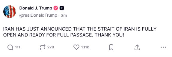 Սպիտակ տան ղեկավարը սոցիալական ցանցի իր էջում կատարած գրառմամբ շնորհակալություն է հայտնել, որ իրանական կողմը տեղեկացրել է Հորմուզի նեղուցի լիարժեք բացման մասին։