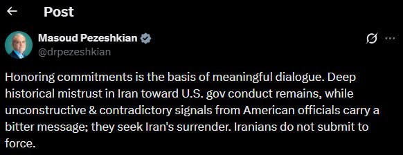 Նախագահը նշել է, որ ամերիկացի պաշտոնյաների կողմից հնչող հակասական ու ոչ կառուցողական ազդակները բացասական ուղերձ են փոխանցում։ Ըստ Փեզեշքիանի՝ այդ գործողությունները վկայում են Իրանի կապիտուլյացիային հասնելու ձգտման մասին, սակայն իրանցիները չեն ընկրկում ուժի առջև։