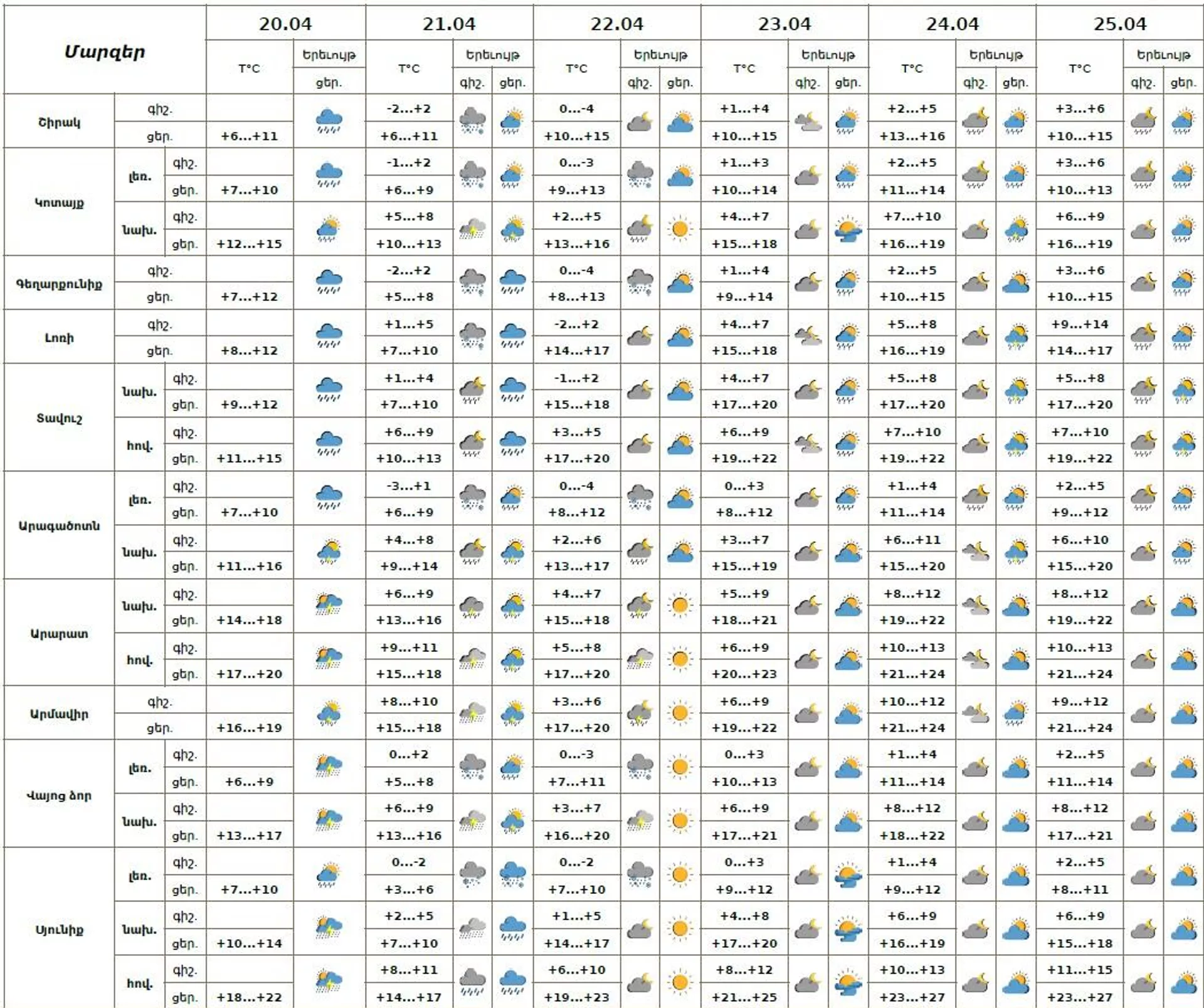 Հայաստանի Հանրապետության տարածքում ապրիլի 21-ին շրջանների զգալի մասում, 22-ի գիշերը, 23-ի ցերեկը, 24-25-ին առանձին շրջաններում սպասվում է անձրև, առանձին հատվածներում՝ ամպրոպ։ Ապրիլի 21-ին առանձին շրջաններում տեղումները կլինեն ինտենսիվ, իսկ լեռնային շրջաններում առավոտյան ժամերին` կլինեն թաց ձյան տեսքով։ Ապրիլի 22-ի ցերեկը, 23-ի գիշերը սպասվում է առանց տեղումների եղանակ։ Տեղեկությունը հայտնում է ՀՀ ՇՄՆ «Հիդրոօդերևութաբանության և մոնիթորինգի կենտրոն»-ը։