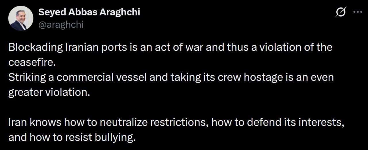 Իրանի արտաքին գործերի նախարար Աբբաս Արաղչին հայտարարել է, որ երկրի նավահանգիստների շրջափակումը հանդիսանում է պատերազմական գործողություն և զինադադարի խախտում։