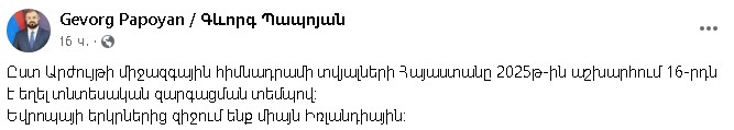 Հայաստանը 2025թ-ին աշխարհում 16-րդն է եղել․ Պապոյանը լավ լուրով է կիսվել