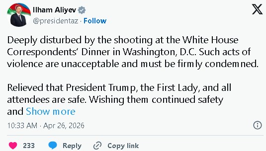 Ես խորապես ցնցված եմ Վաշինգտոնում տեղի ունեցած հրաձգությունից։ Այս մասին Ադրբեջանի նախագահ Իլհամ Ալիևը գրել է X-ի իր հաշվում։