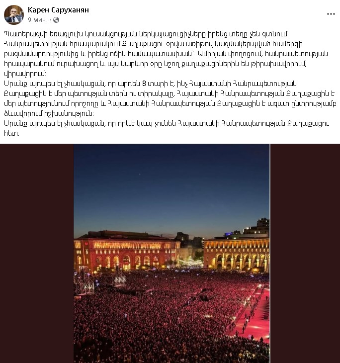 «Պատերազմի եռագլուխ կուսակցության ներկայացուցիչները իրենց տեղը չեն գտնում Հանրապետության հրապարակում Քաղաքացու օրվա առիթով կազմակերպված համերգի բազմամարդությունից և իրենց ոճին համապատասխան` Ամիրյան փողոցում, հանրապետության հրապարակում ուրախացող և այս կարևոր օրը նշող քաղաքացիներին են թիրախավորում, վիրավորում։