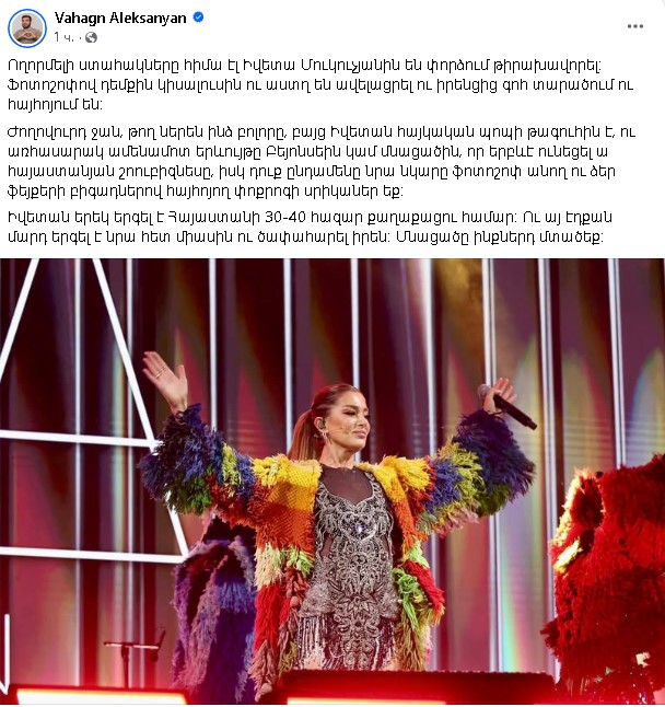 Իվետան երեկ երգել է Հայաստանի 30-40 հազար քաղաքացու համար։ Ու այ էդքան մարդ երգել է նրա հետ միասին ու ծափահարել իրեն։ Մնացածը ինքներդ մտածեք»,- գրել է Վահագն Ալեքսանյանը։