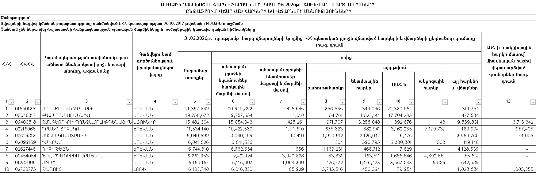 1000 խոշոր հարկ վճարողների կողմից 2026 թվականի հունվար-մարտ ամիսների ընթացքում պետական բյուջե ընդհանուր առմամբ վճարվել է ավելի քան 459 միլիարդ 270 միլիոն դրամ։ Պետական բյուջե է մուտքագրվել նախորդ տարվա նույն ցուցանիշից ավելի 49 միլիարդ 916 միլիոն դրամ․ նախորդ տարվա նույն ցուցանիշը կազմել է ավելի քան 409 միլիարդ 353 միլիոն դրամ: