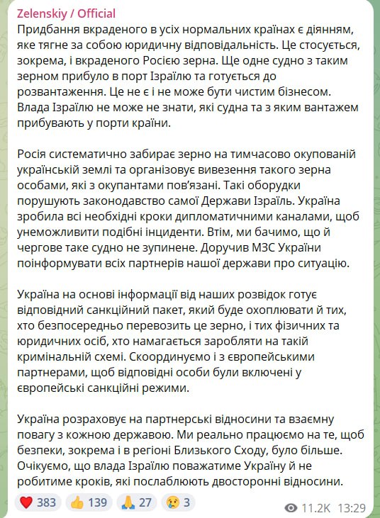 Խոսքը վերաբերում է Իսրայելի նավահանգստի կողմից Դոնբասից ուղարկված հացահատիկով բեռի ընդունմանը։ Զելենսկին նշել է, որ դա չի կարող դիտարկվել որպես մասնավոր բիզնես, քանի որ Իսրայելի իշխանությունները պարտավոր են տեղեկացված լինել երկրի նավահանգիստներ ժամանող նավերի և դրանց բեռների մասին։