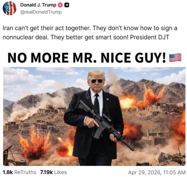 Լուսանկարում Թրամփը պատկերված է ինքնաձիգով, իսկ պատկերին կից առկա է «Այլևս ոչ մի պարոն բարի տղա» գրությունը։
